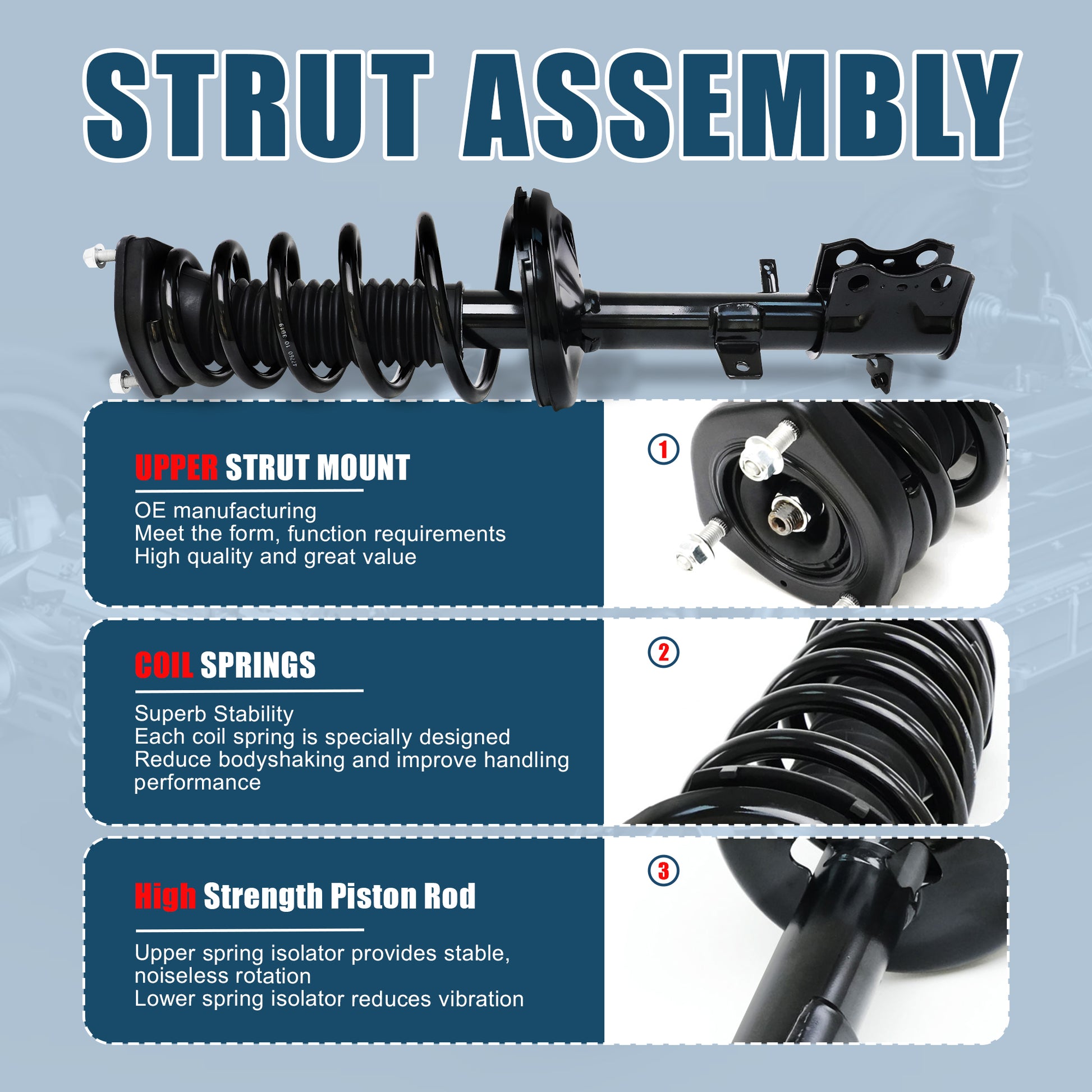 The tall upper strut is engineered to promote smooth and quiet rotation, while the lower spring isolator helps decline metal-on-metal contact and reduce vibrations. |