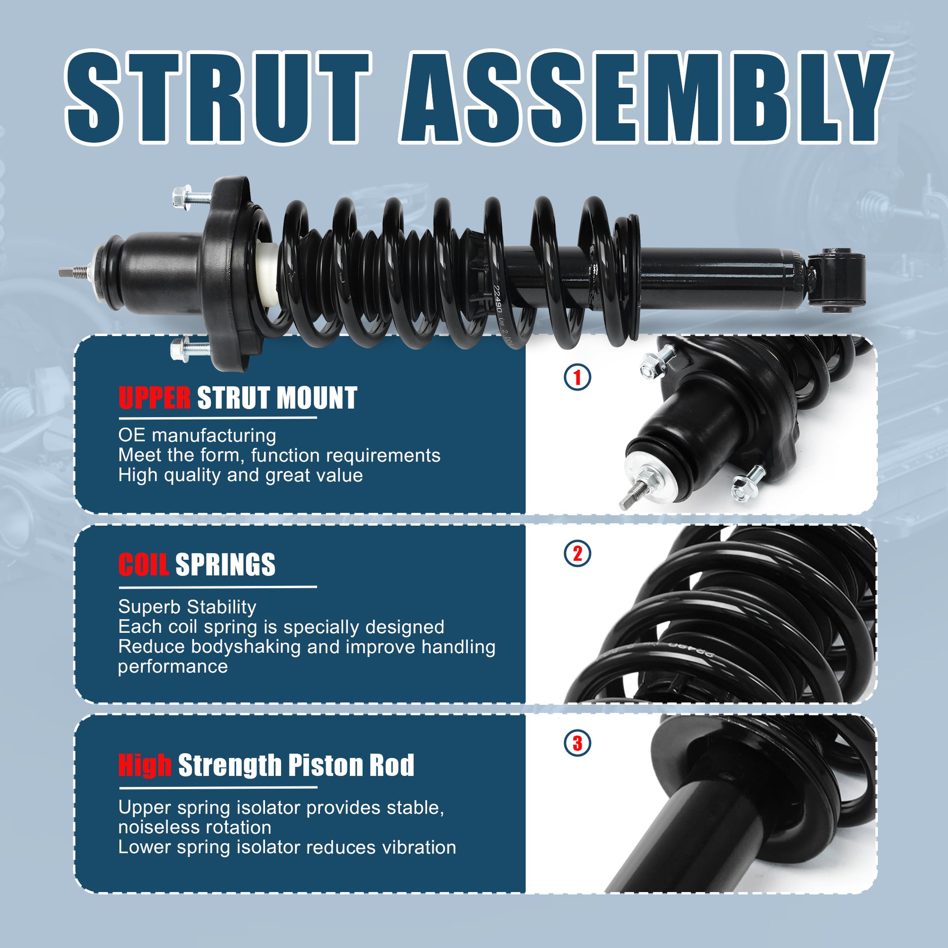 The tall upper strut is engineered to promote smooth and quiet rotation, while the lower spring isolator helps decline metal-on-metal contact and reduce vibrations. |